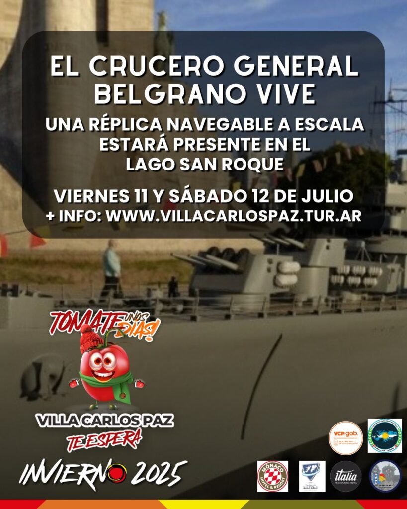 Con la organización del Centro de Veteranos de Guerra de Malvinas Punilla Sur y con el apoyo de la Municipalidad de Villa Carlos Paz, en homenaje a los 323 Héroes Caídos en el Crucero ARA General Belgrano, una réplica navegable a escala estará presente en Villa Carlos Paz a partir del viernes 11 de julio.